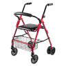 Складные опоры-ходунки(ролятор) из хромированной стали имеют три литых колеса, ручные стояночные тормоза, а также съемную вместительную корзину для личных вещей и покупок.